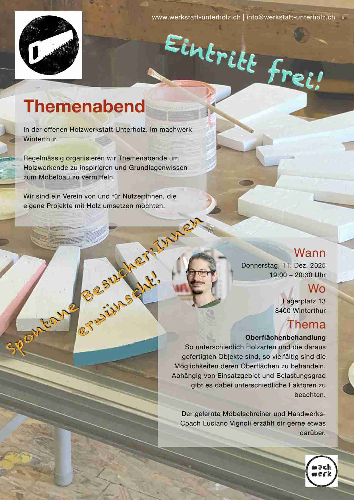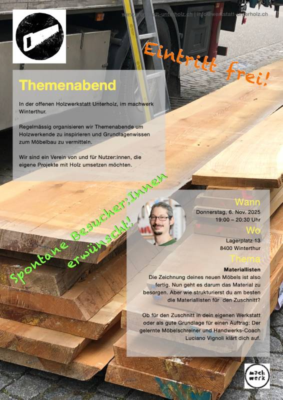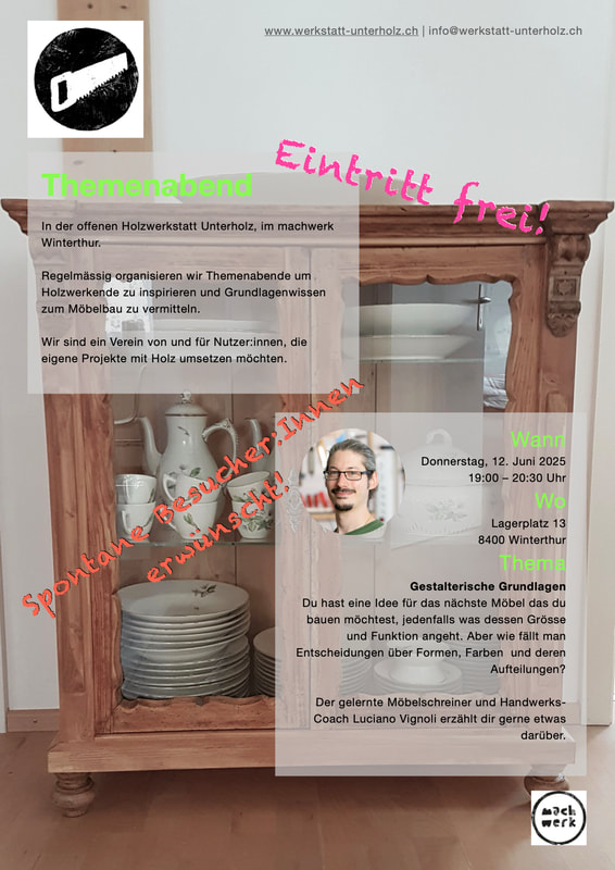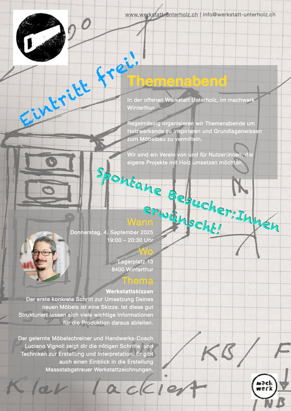Am 19. September 2024, 19:00 Uhr, findet wieder ein Themenabend für alle interessierten Personen in der offenen Holzwerkstatt am Lagerplatz 13, 8400 Winterthur statt. Der Eintritt ist frei, eine Spendenkasse wird bereitgestellt. Es referiert der gelernte Möbelschreiner, Gestalter im Handwerk und Vorstandsmitglied der Werkstatt Unterholz Luciano Vignoli zum Thema «Einfache Eckverbindungen».